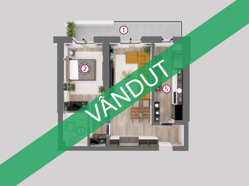 Suprafață 55,77 mp | Balcon 23,6 mp | Preț (fără TVA): Vândut