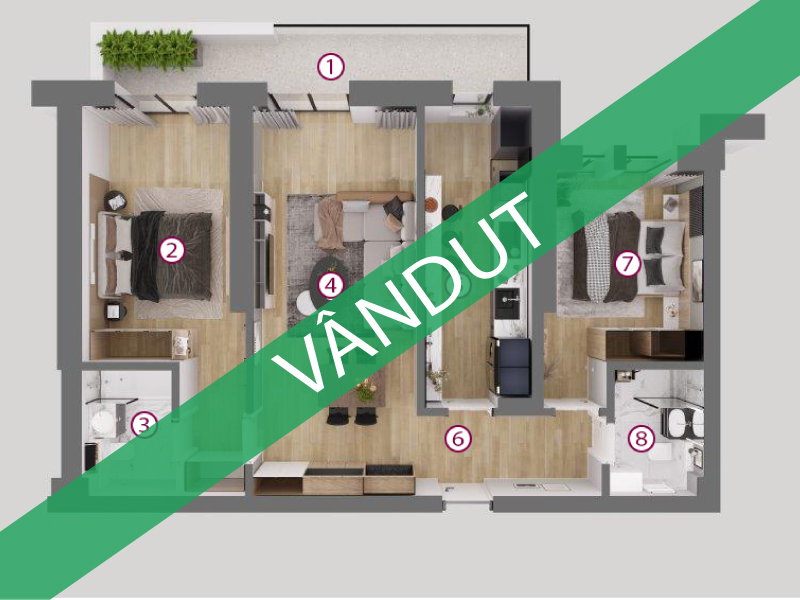 Suprafață: 55,77 mp | 2 balcoane 11,15 mp | Preț (fără TVA): Vândut