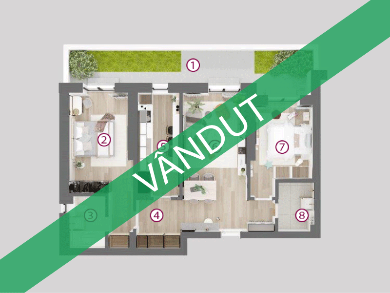 Suprafață: 55,77 mp | Terasă & grădină: 28,41 mp | Preț (fără TVA): Vândut