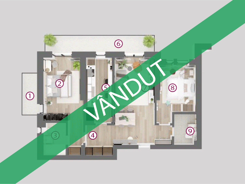 Suprafață: 56,2 mp | Terasă: 18,24 mp | Preț (fără TVA): Vândut